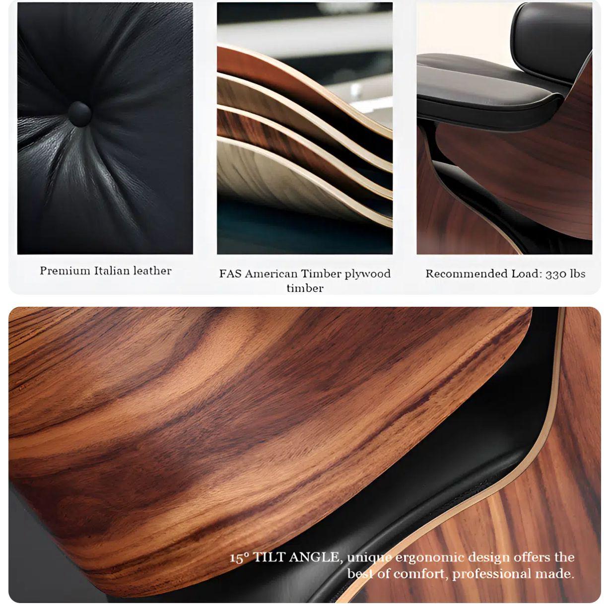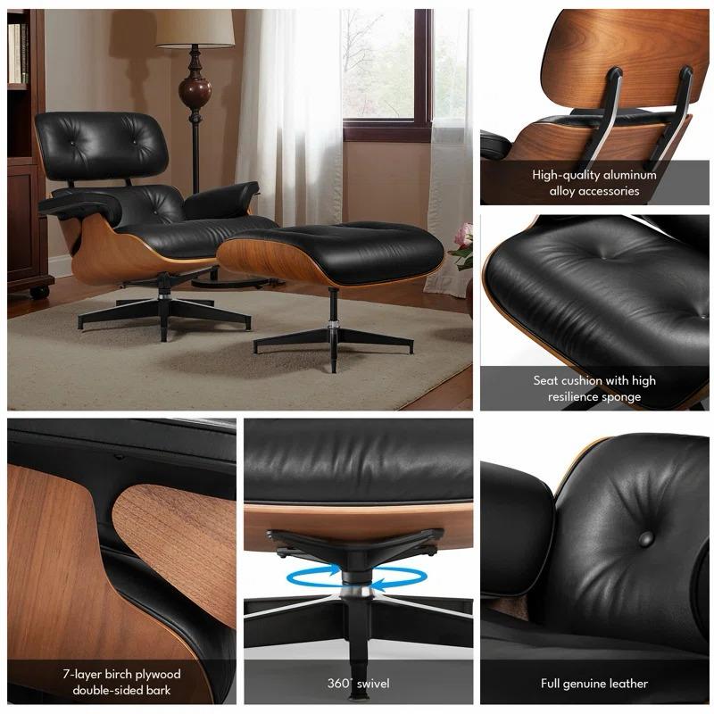 Materiales: Asiento, respaldo, reposabrazos y ottoman tapizados en piel o piel de potro, contracara del respaldo, asiento y ottoman en madera contrachapada de roble blanco, nogal o palo de rosa y base giratoria del sillón y ottoman de aluminio fundido.